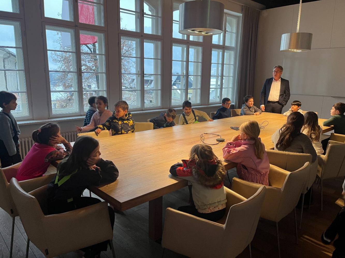 Heute durfte die 1c beim Bürgermeister und im Rathaus zu Gast sein! Wir wurden herzlich von Martin Krumschnabel und seinem Team empfangen. Eine Führung durch das Rathaus und seine vielen Räumlichkeiten führte die Kinder auch ins Standesamt und Meldewesen. Der Sitzungssaal und das Büro des Bürgermeisters konnten auch besichtigt werden. Dort überreichten wir ein Geschenk und brachten ein Lied dar. Wir erfuhren Vieles über den Umbau des Gebäudes sowie über das alte Kufstein. Zum Abschluss gab es eine stärkende Jause! Wir bedankten uns sehr für den spannenden Vormittag!